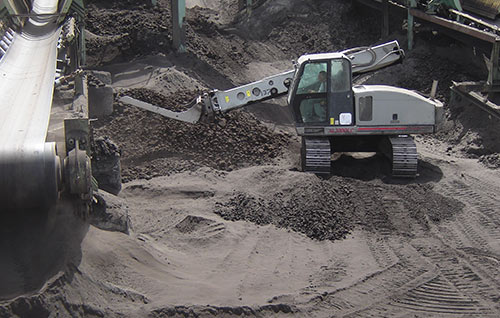 Maneuvering into position on rubber tires, the steering axle is fitted with an axle oscillation assembly to create a stable working platform without the need for outriggers as the powerful boom efficiently tilts and pries material loose.